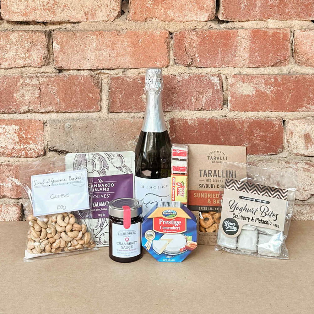 Celebrate the festive season with Comet’s Gift Box, a delicious selection of Christmas favourites to share. Enjoy a choice of Reschke R-Series Sparkling or Maggie Beer Non-Alcoholic Sparkling, paired with creamy Camembert Cheese, Continental Taralli Tarallini, Kangaroo Island Olives, and Beerenberg Cranberry Sauce. For a sweet finish, indulge in Salted Cashew Nuts, Cranberry & Pistachio Yoghurt Bites, and Fudge It Rocky Road.