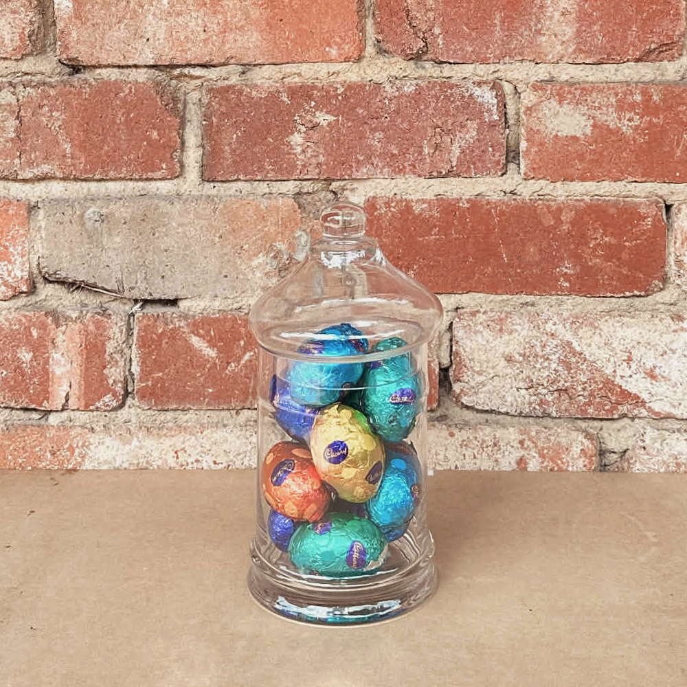 Presented in a large glass lolly jar, it’s filled with 11 delicious 17g Cadbury chocolate eggs, perfect for gifting, sharing, or enjoying yourself. The jar can also be reused for storing treats or keepsakes.
